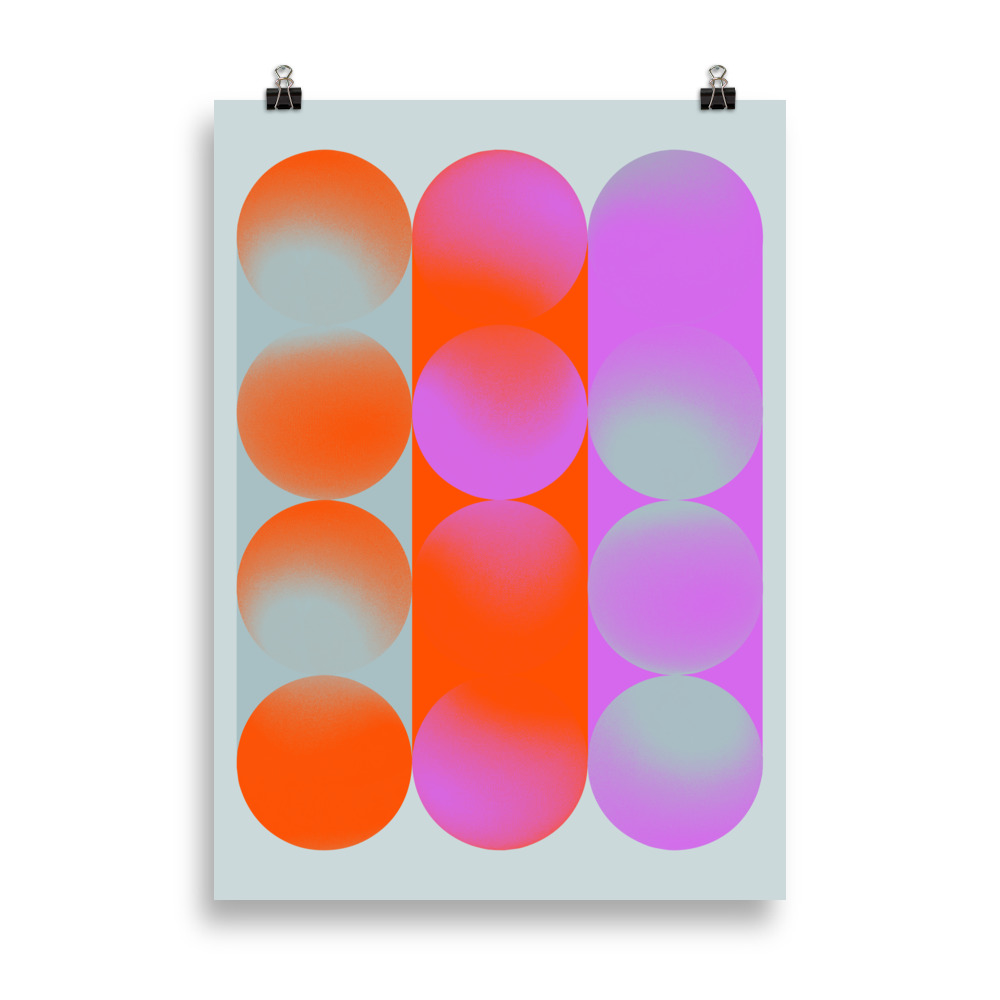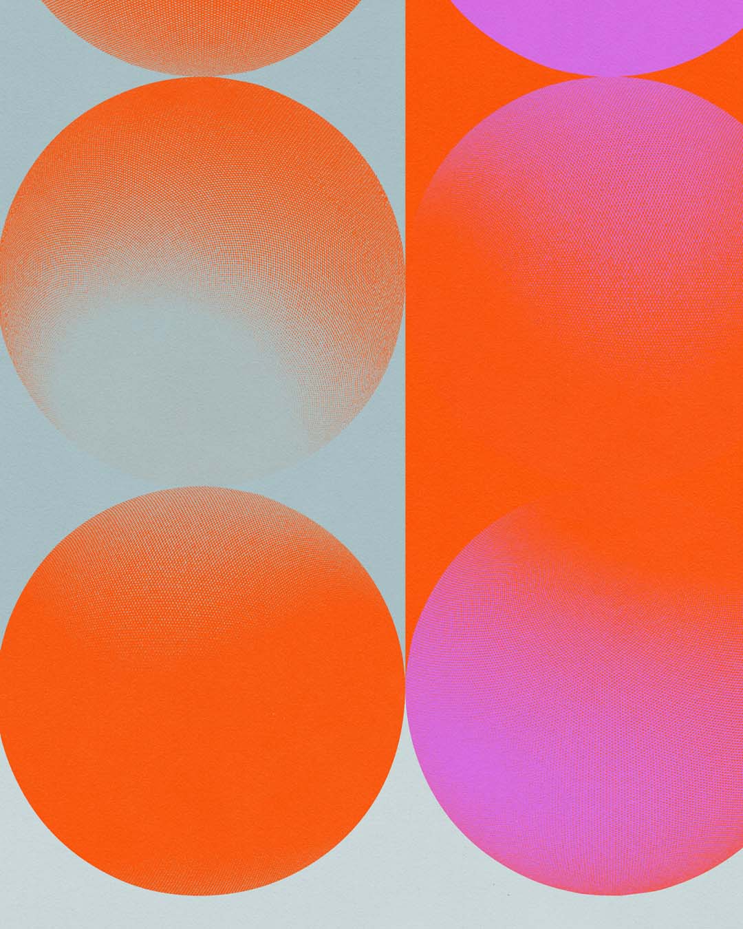 In his work, he focuses on the contrast between pop-colored and halftone graphics that seem rather out of time. A mixture of emotion and technique. The textures form a gradient at a distance, really break upon closer inspection, and come to life on large format prints.